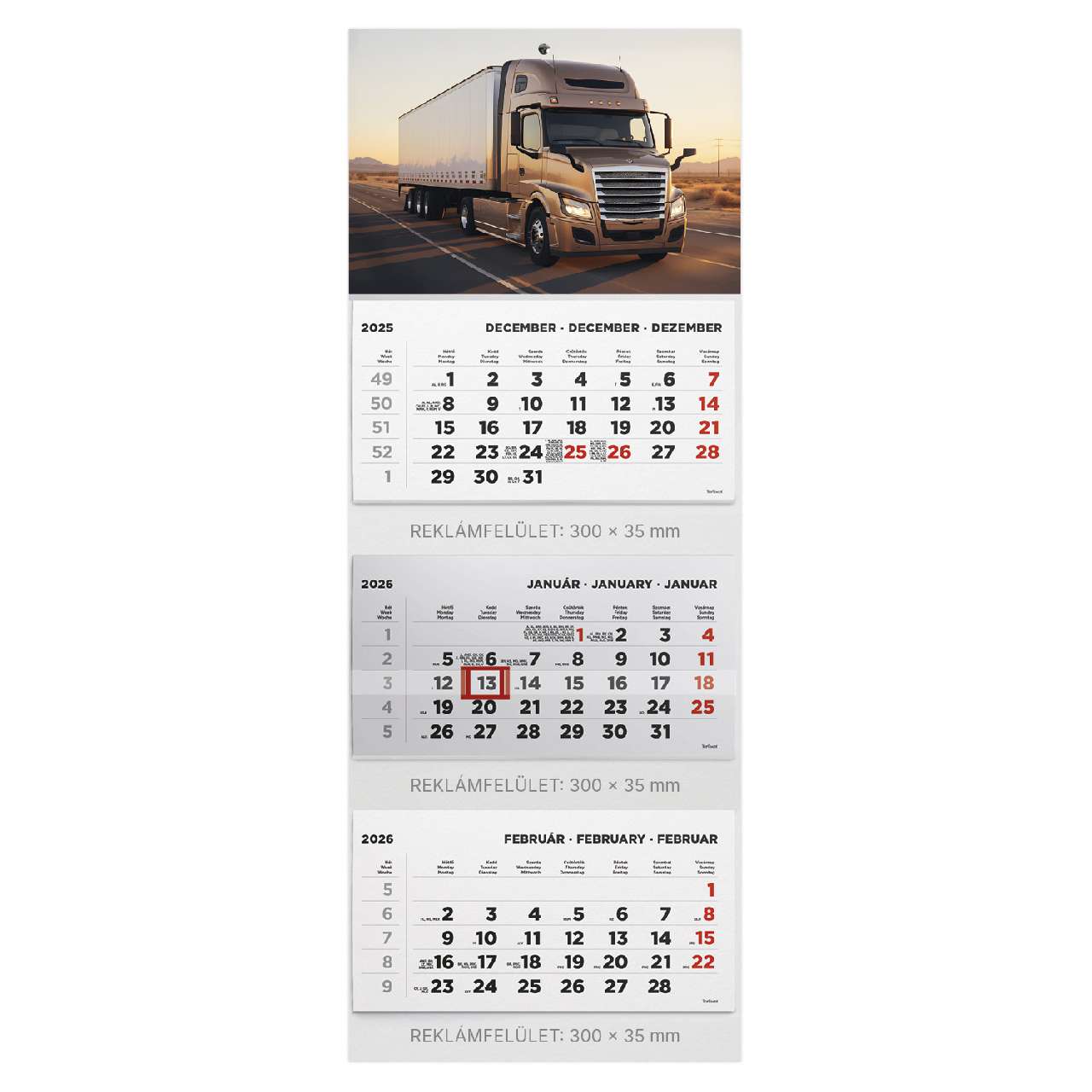 SPEDITŐRNAPTÁR 2026 T070-006, 3 TÖMBBŐL 3 HAVI, 315 MM X 852 MM, KAMION