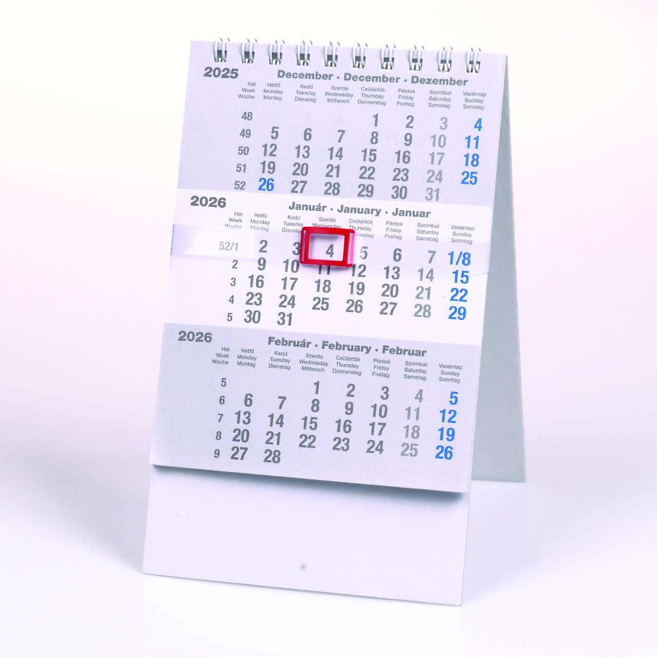 Papírtáblás, fehér tömbös, álló asztali speditőrnaptár.Naptárbeosztás laponként 3 hónap