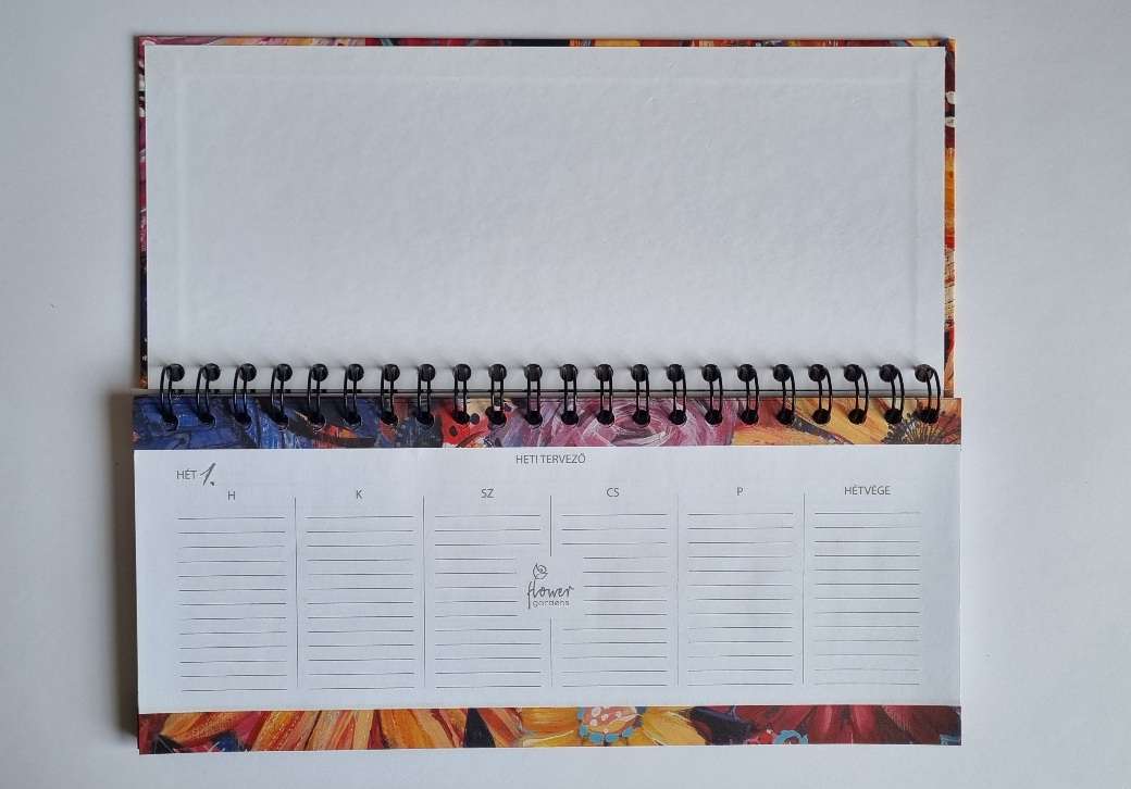 Fekvő formátumú asztali naptár. Kivitele: spirálos. Mérete: 285x136 mm. Heti beosztású, naponta 8-18 óráig. Anyaga: 70g fehér ofszet papír. Magyar ünnepek, névnapok feltüntetésével. A hátlap nem tartozék.