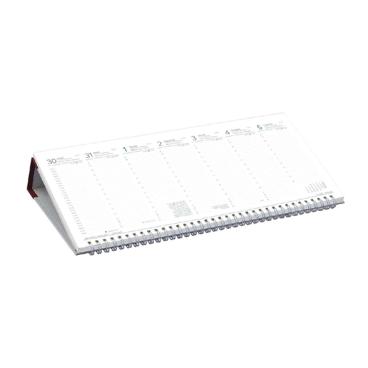 Műbőr táblával készült, fehér, fekvő asztali naptár. Vaknyomással emblémázható. Beosztása: 6-22 óráig, 8-18 óráig félórás beosztással.