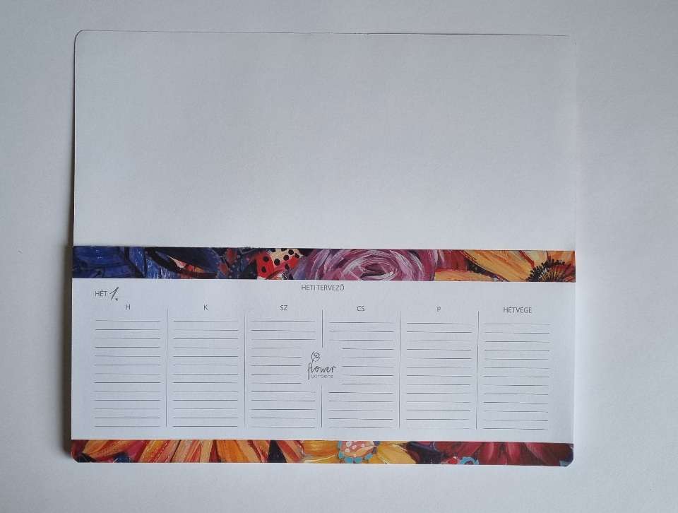 Formátum: 290 x 125 mm Beosztás: heti Terjedelem: 120 oldal Papír: 70g fehér ofszet Naptárfedél: keményfedeles papírborító, soft touch fóliával Extrák: ikerspirálos