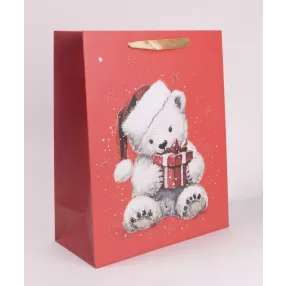 AJÁNDÉKTASAK, KARÁCSONYI, 18X23CM, MEDVE AJÁNDÉKKAL
