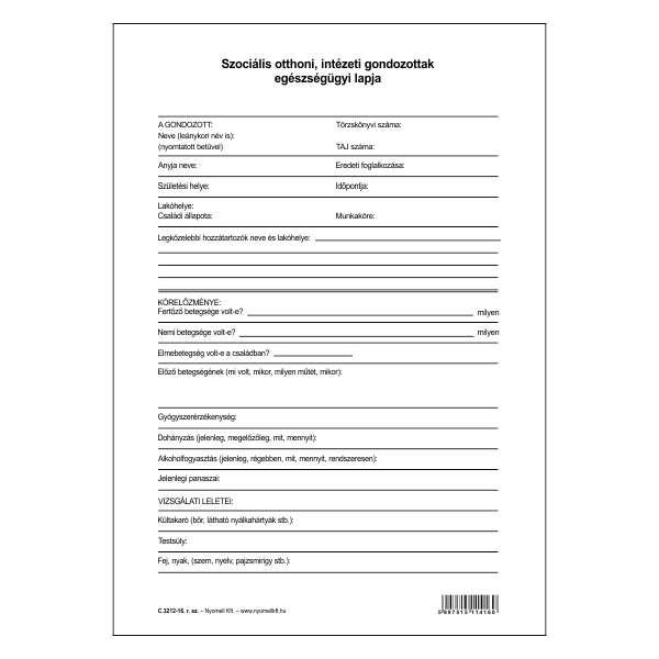 C.3212-16 SZOCIÁLIS OTTHONI, INTÉZETI GONDOZOTTAK EGÉSZSÉGÜGYI LAPJA, A/4